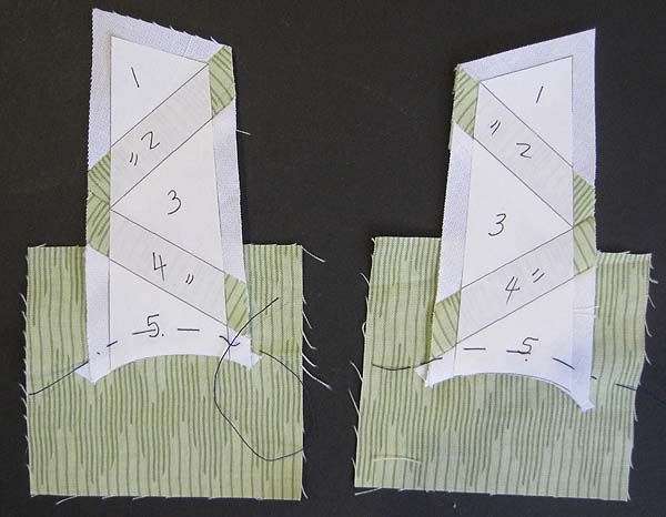 Attach the small pieced section. When the angle is this sharp, I sew one seam by machine and applique the other edge. Sounds weird, I know, but it helps me avoid stretching the fabric by trying to manipulate it under the sewing machine foot.